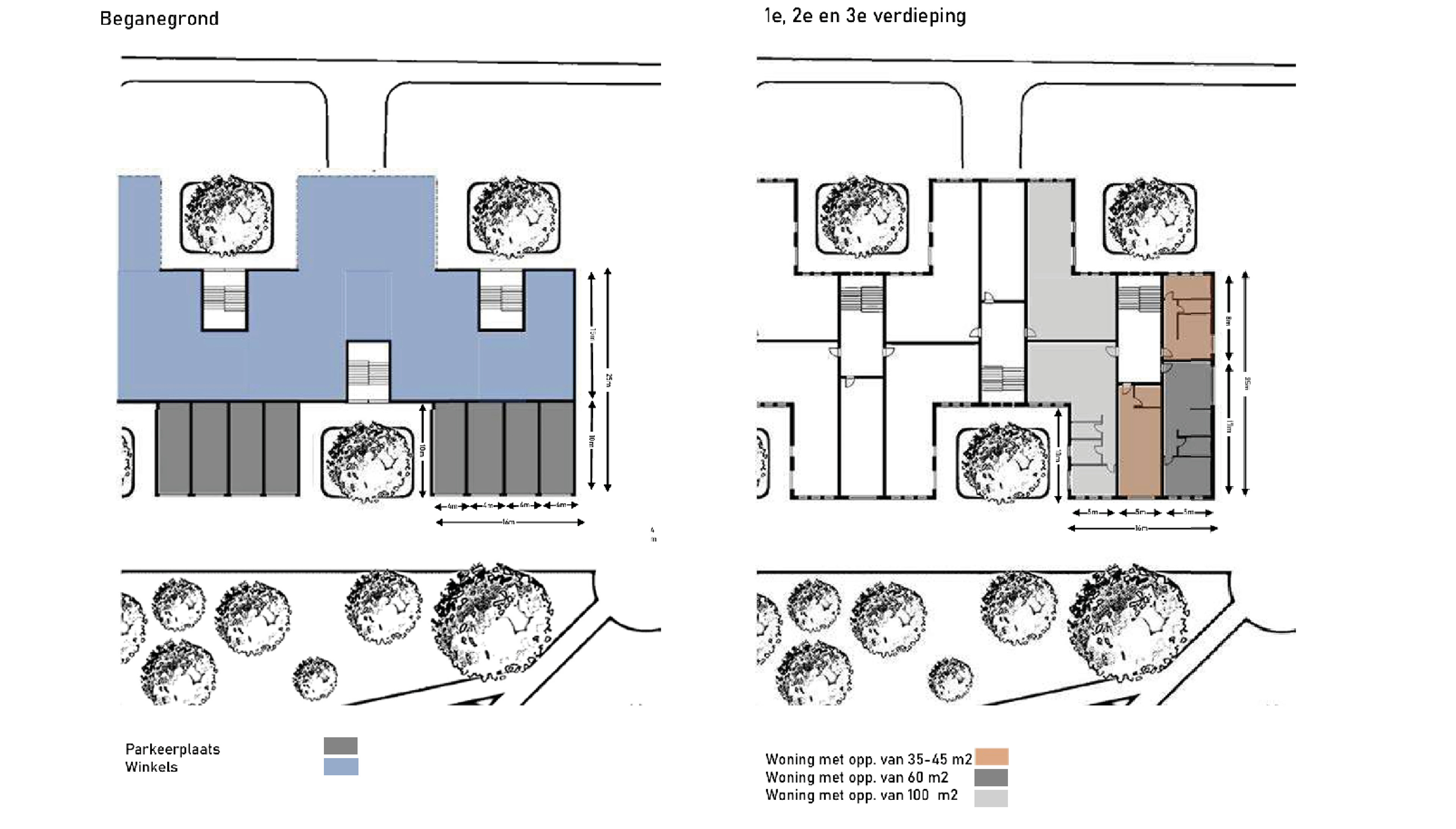 Binnen het woonprogramma is bewust gekozen voor een diversiteit aan woningtypologieën, zodat het gebied aantrekkelijk is voor verschillende doelgroepen. Compacte woningen van 35 tot 45 m² bieden ruimte aan starters en alleenstaanden, terwijl middelgrote appartementen van circa 60 m² geschikt zijn voor kleine huishoudens of jonge gezinnen. De ruimere woningen van ongeveer 100 m² bieden comfort en flexibiliteit voor gezinnen of bewoners die meer ruimte wensen. Door deze mix ontstaat een inclusieve woonomgeving waarin verschillende generaties en leefstijlen samenkomen.