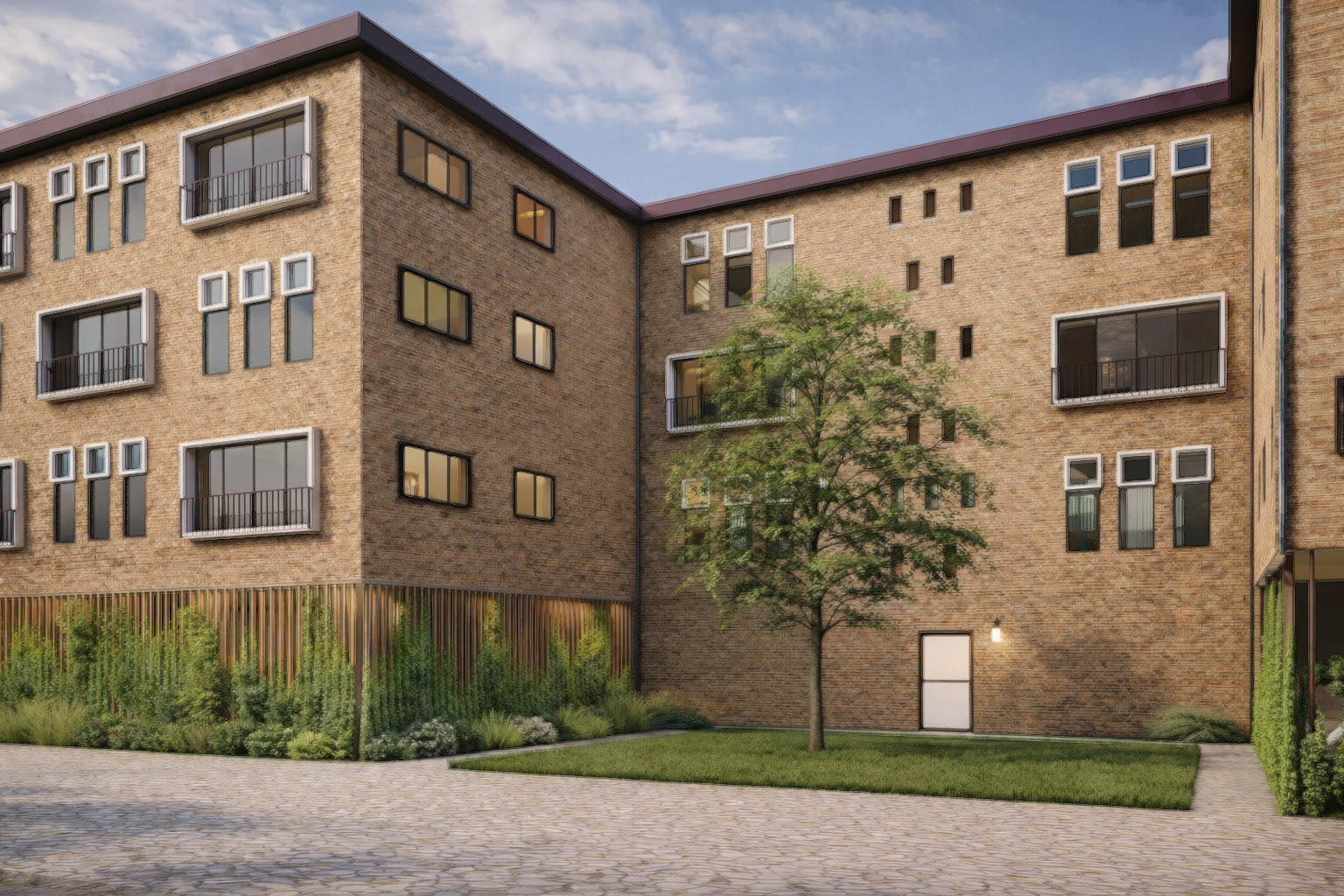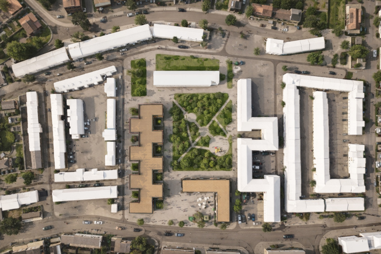Binnen De Groene Ader staan kleine pleinen en groene binnenhoven centraal. Deze plekken zijn ontworpen op menselijke schaal en nodigen uit tot contact, spel en ontspanning. In het hart van elk plein staat een boom die het plein identiteit geeft en zorgt voor schaduw, beschutting en een gevoel van geborgenheid. Het groen is niet slechts een decoratief element, maar een actief onderdeel van de leefkwaliteit: het verzacht de overgang tussen privé en openbaar, vergroot de biodiversiteit en draagt bij aan een gezonde, natuurlijke leefomgeving.