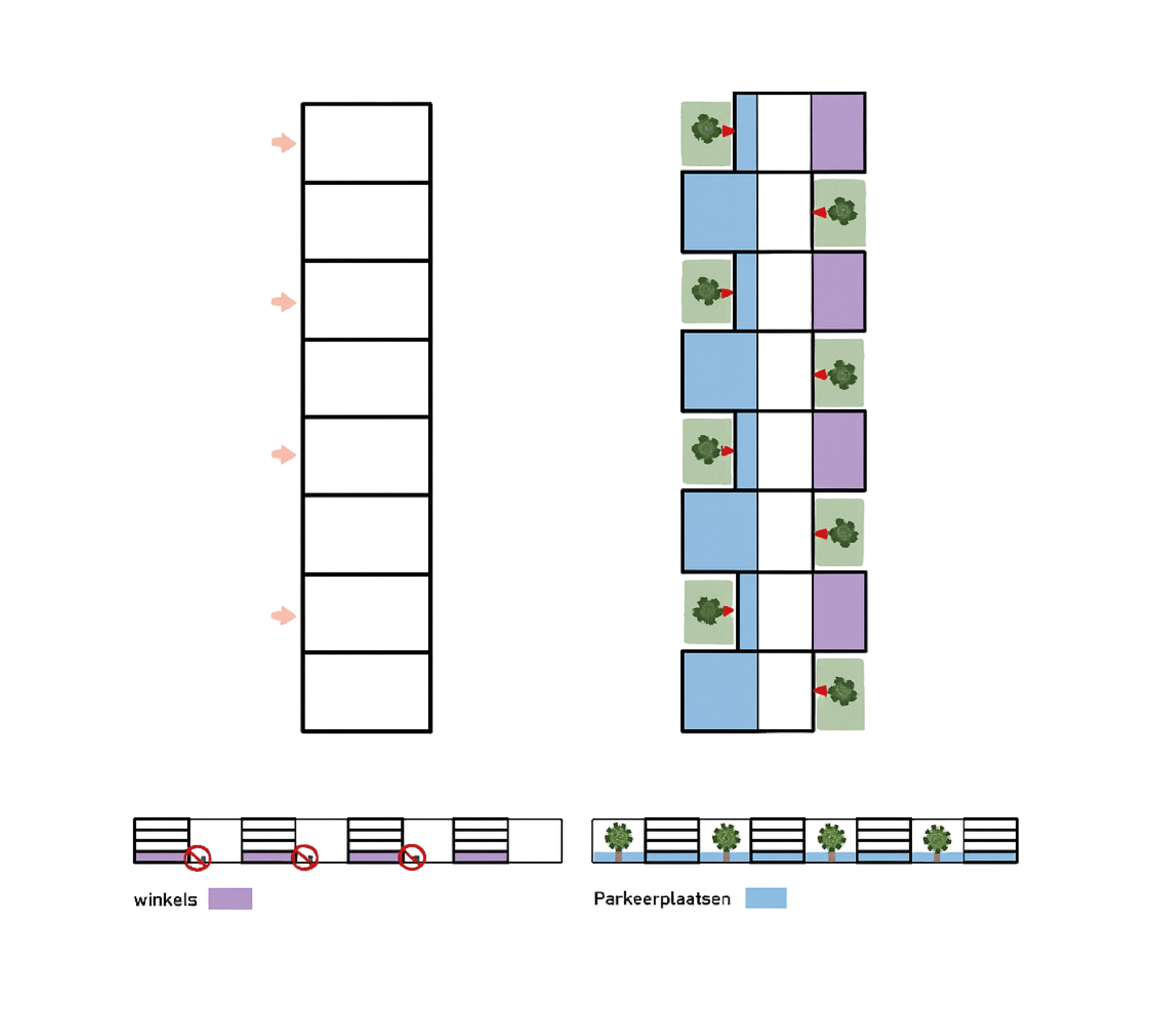 De opzet van het plan zorgt voor een balans tussen levendigheid en privacy. Aan de straatzijde bevindt zich een levendige commerciële plint met winkels en voorzieningen die het dagelijks leven vergemakkelijken en het straatbeeld activeren. Daarboven liggen de woningen, die profiteren van de beschutte ligging en het uitzicht op de groene pleinen. Dankzij de positionering van de bouwdelen en de groenstructuren kijken bewoners niet direct bij elkaar naar binnen, waardoor een gevoel van rust en geborgenheid ontstaat, zonder het sociale karakter van de buurt te verliezen.