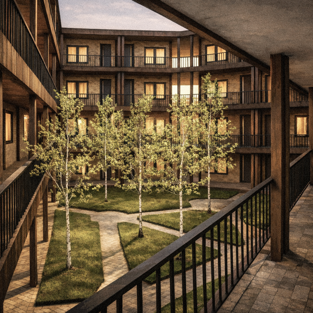 Verdiepingen: compacte, efficiënte woningen voor jongeren zijn geordend rondom de hof. Iedere woning heeft toegang tot buitenruimte en zicht op groen.