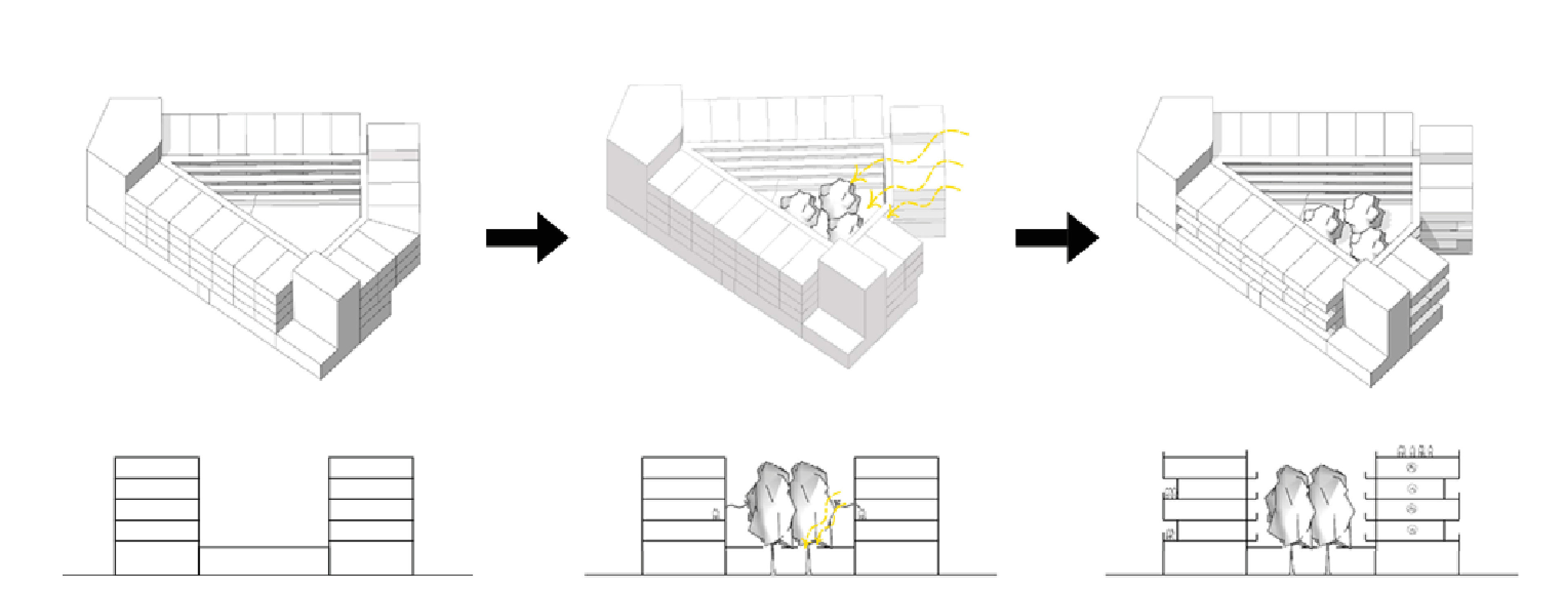 De opzet bestaat uit een gesloten stedelijk blok met een open binnenhof. Deze hof vormt het sociale en groene hart van het project.
