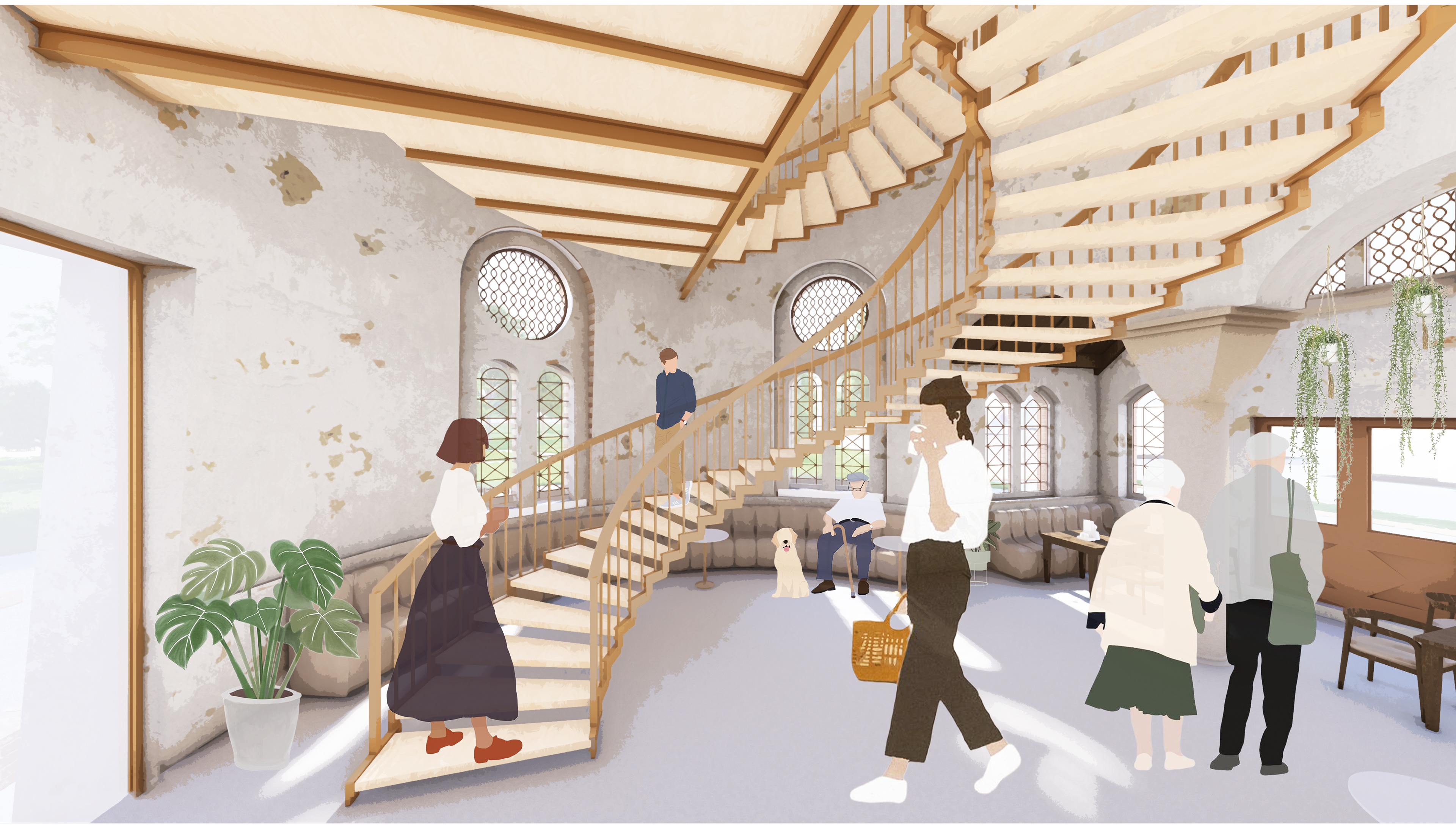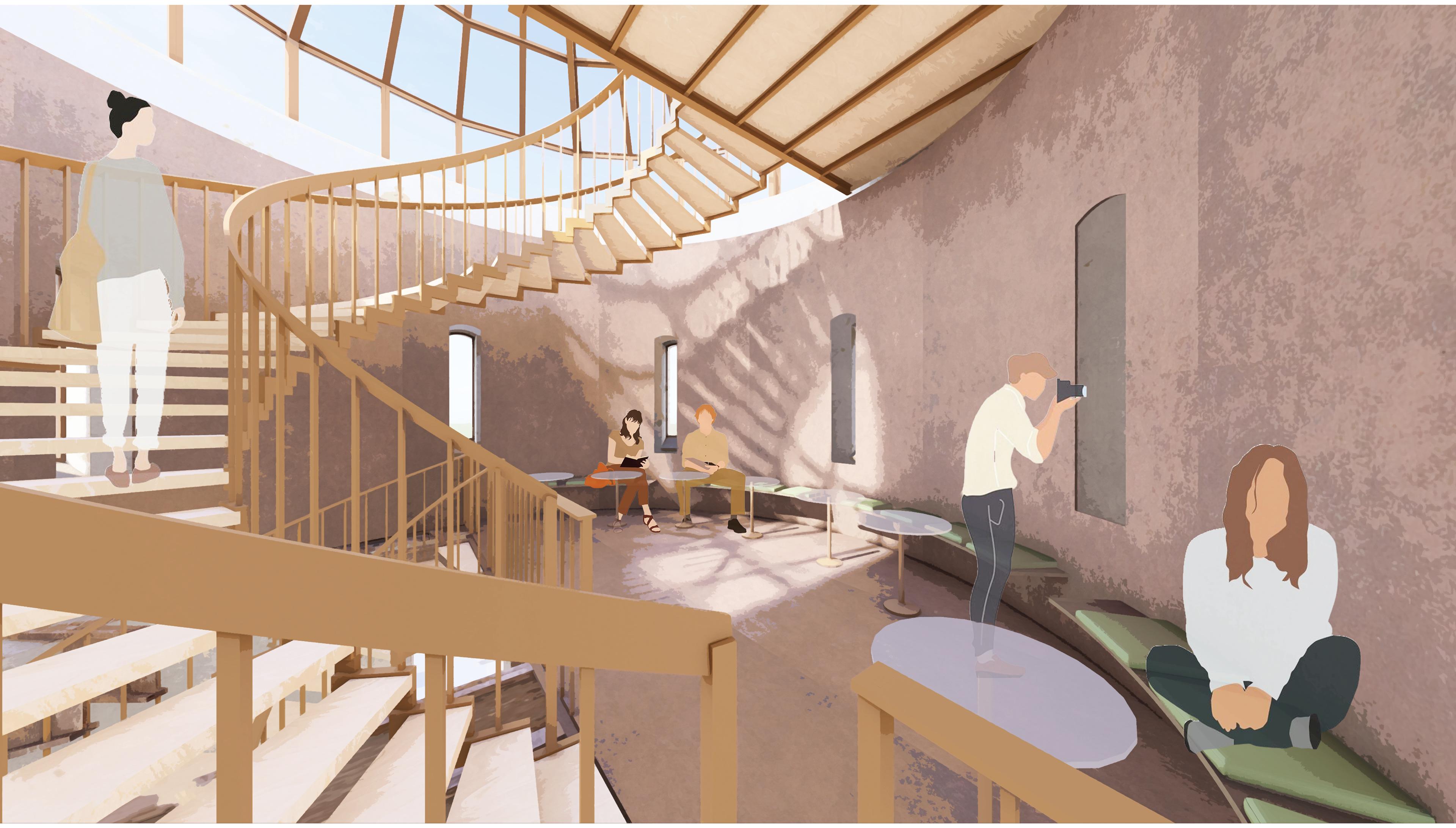 Binnenin is een nieuwe houten trapconstructie geïntroduceerd die zich als een lichte, sculpturale spiraal omhoog beweegt. Deze verticale toevoeging contrasteert subtiel met het robuuste karakter van de oude torenschil, zonder deze te overheersen. Op elk niveau creëren houten plateaus met zitplekken intieme verblijfsruimtes, waarbij het daglicht door smalle openingen en het transparante dak geleidelijk verandert van sfeer. De route naar boven wordt zo een gelaagde beleving van stilte, uitzicht en materiaal.