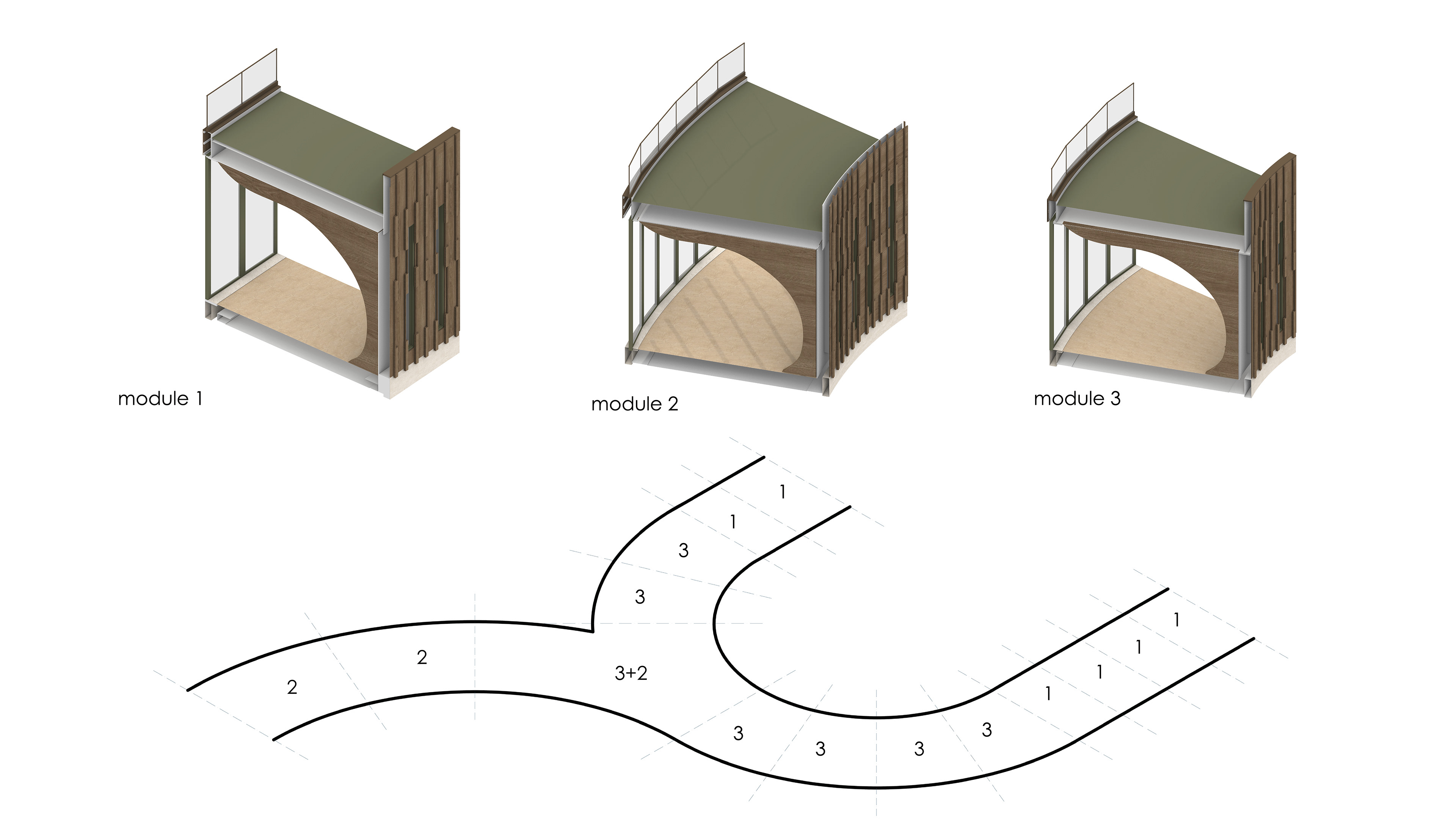 De nieuwbouw rondom de toren vertaalt zich in een lichte, houten structuur opgebouwd uit modulaire elementen. De ritmiek van de gebogen kolommen en het spel van schaduw en licht zorgen voor een open en warme sfeer. Grote glazen puien verbinden het interieur direct met de omliggende natuur. De vloeiende vorm begeleidt de bezoeker op een vanzelfsprekende manier door de ruimte, terwijl de houten detaillering zorgt voor tactiliteit en herkenning.