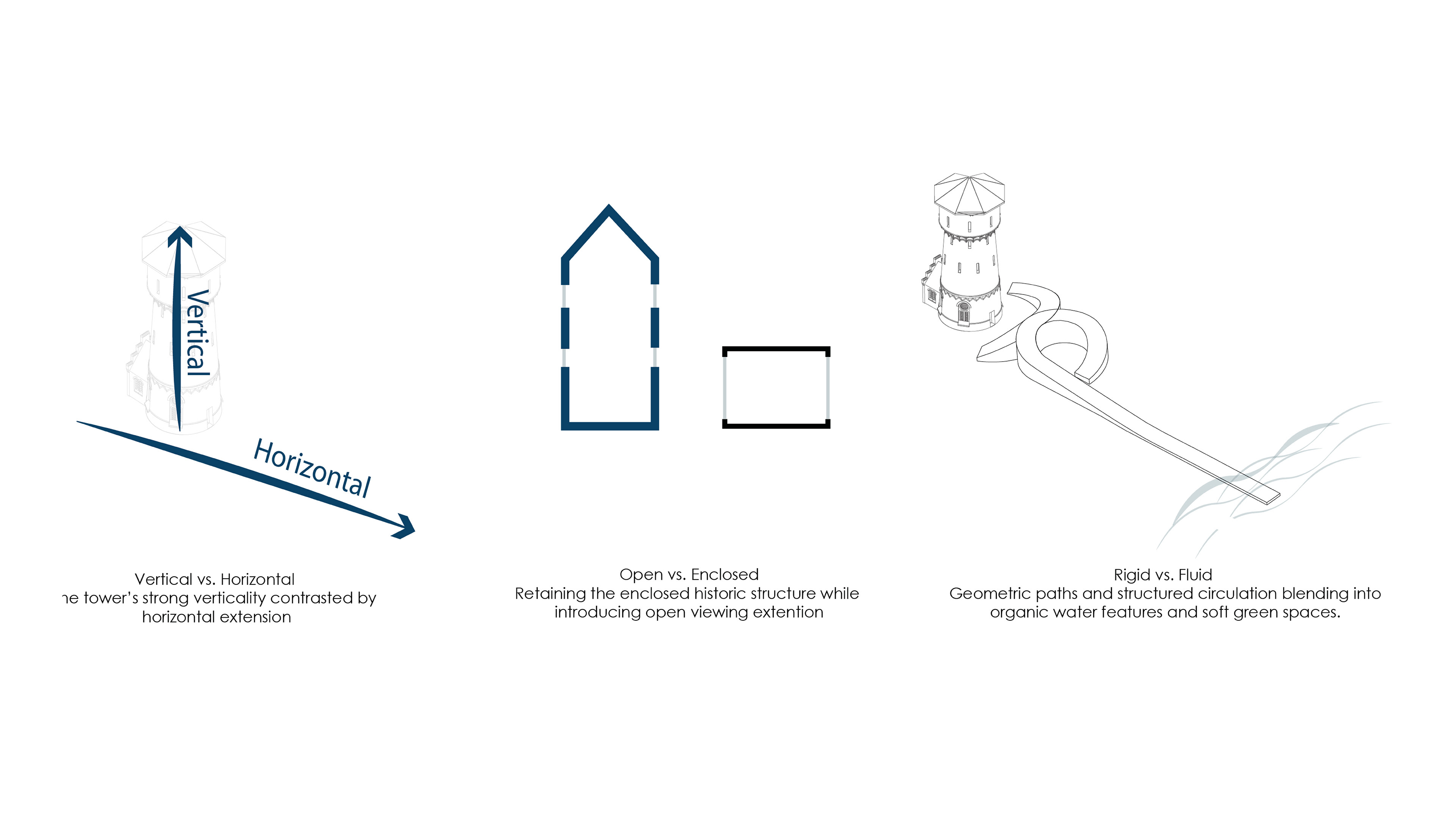 Deze dualiteit tussen oud en nieuw, verticaal en horizontaal, gesloten en transparant, vormt de kern van de ruimtelijke strategie. De toren kijkt uit over de stad, de uitbreiding richt zich op het water en de natuur. Samen creëren ze een dialoog tussen verleden en toekomst, monumentaliteit en menselijkheid.