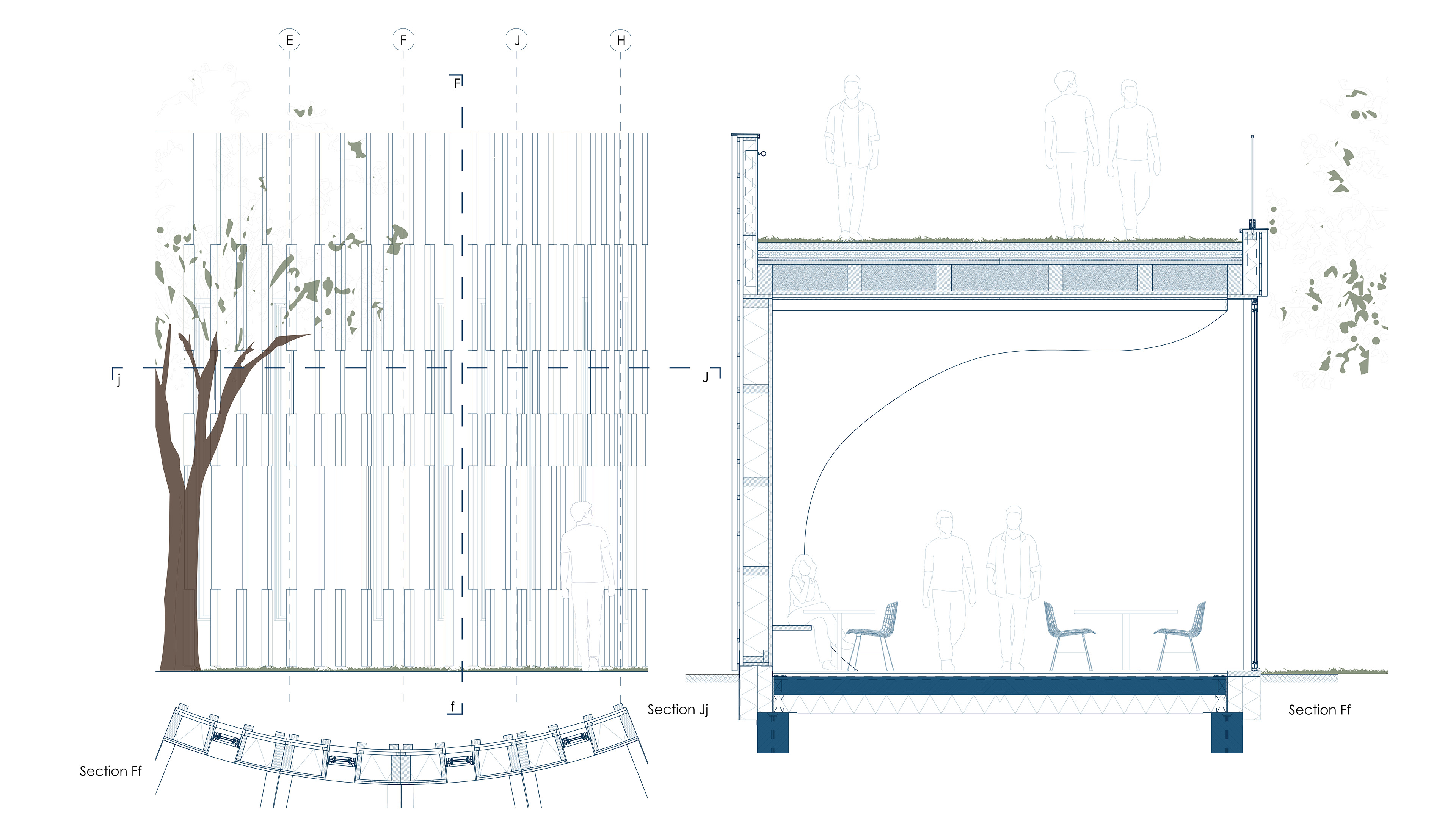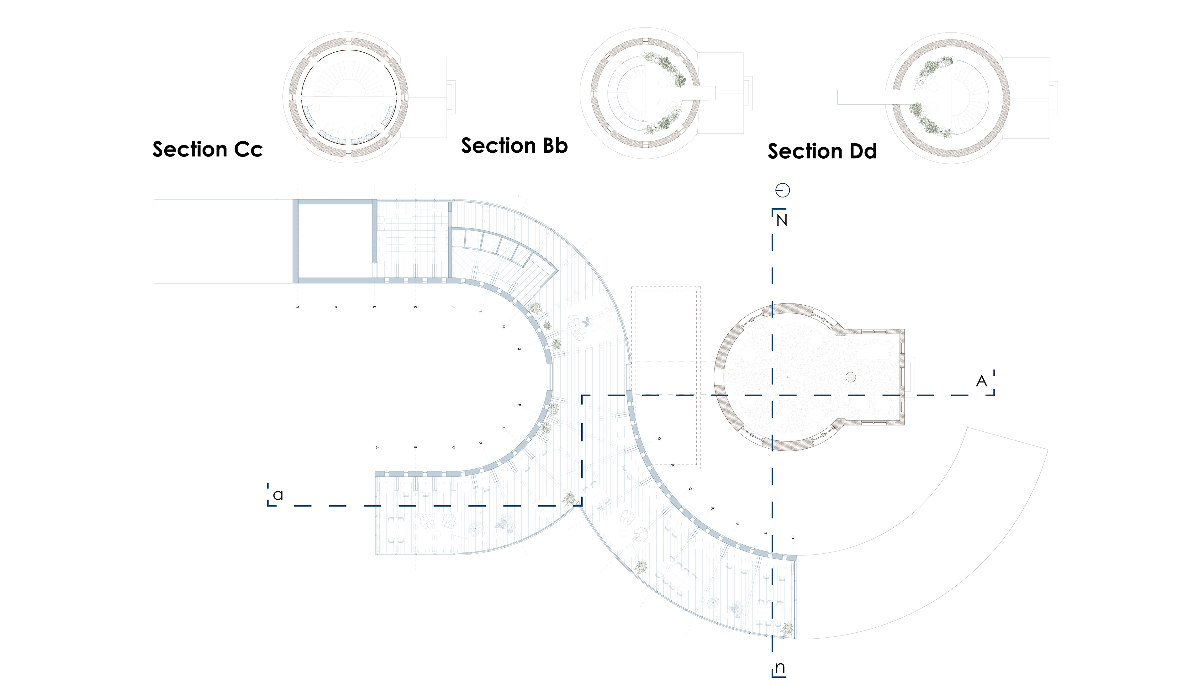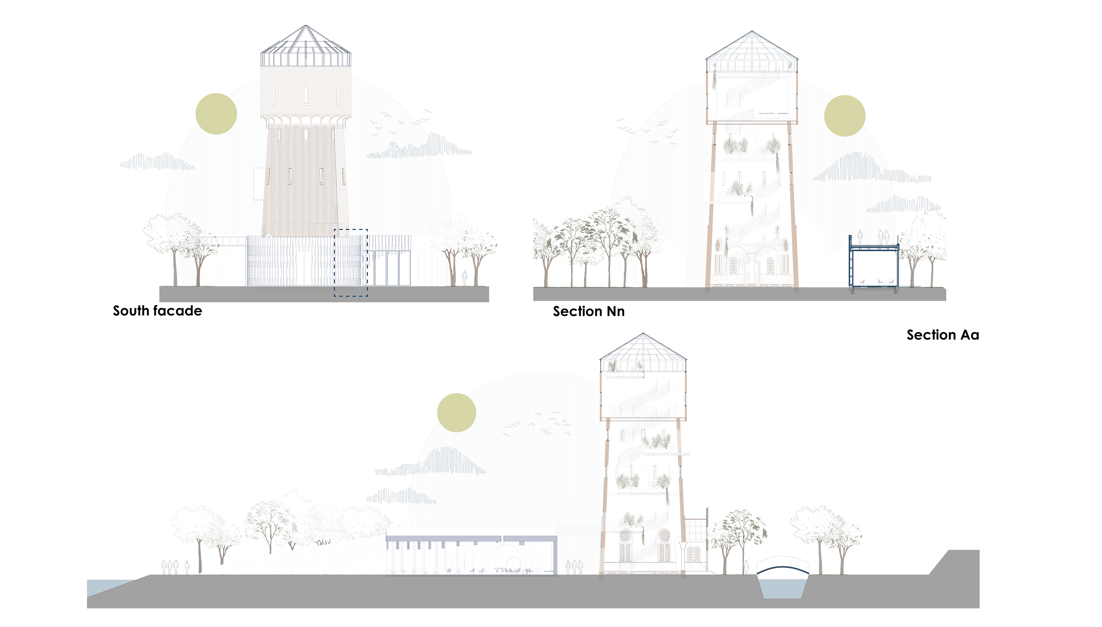 In de doorsnedes wordt duidelijk hoe de uitbreiding zich in het landschap nestelt en hoe het interieur voorziet in open, daglichtrijke ruimtes. Binnenin de toren is een nieuwe verticale trapstructuur geïntroduceerd die de verschillende niveaus verbindt. Deze structuur begeleidt de gebruiker langs groene plateaus richting het uitkijkpunt bovenin de toren.