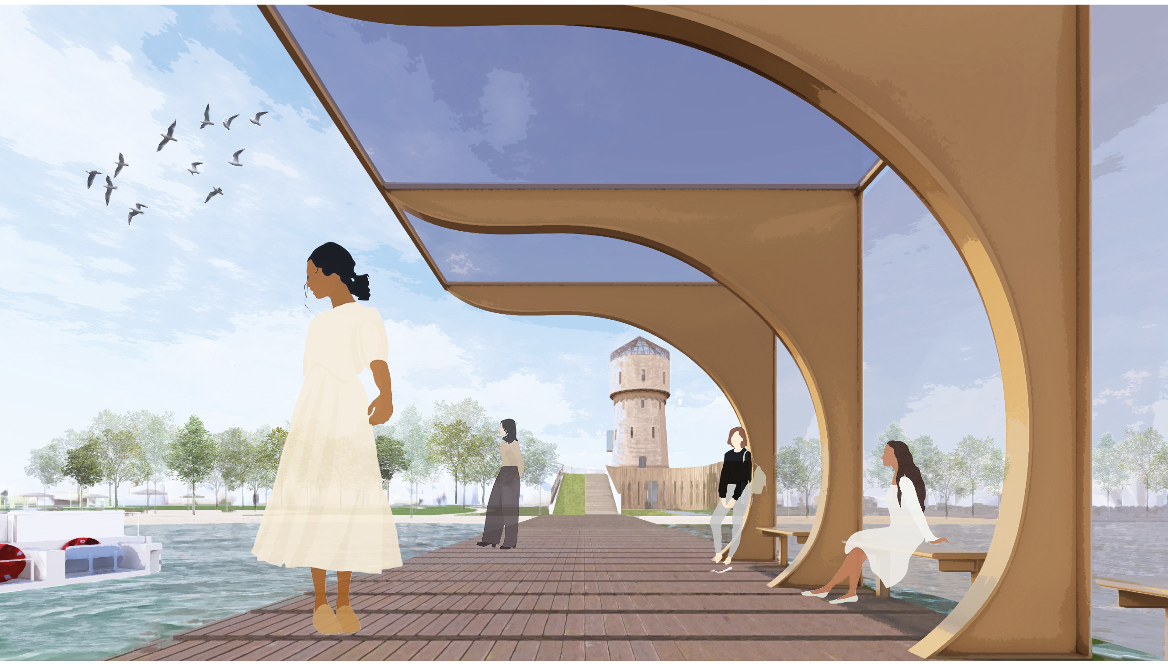 Aan de waterzijde vormt een nieuwe steiger met overkapping een herkenbare entree. Hier kunnen gebruikers van de waterbus aanmeren of plaatsnemen op de zitplekken onder de beschutte structuur. Deze ruimte is ontworpen voor passanten, recreanten en buurtbewoners die de rivier als onderdeel van hun dagelijkse omgeving ervaren. De overkapping biedt beschutting en uitzicht — een plek tussen reizen en verblijven.