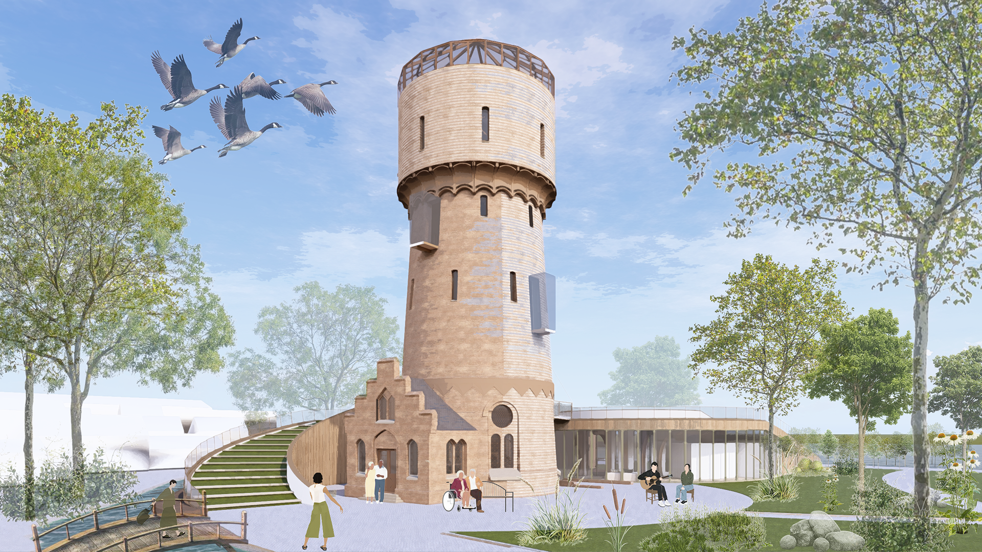 In de omsloten binnentuin, gevormd door de lusvormige uitbreiding, ontstaat een intieme en veilige plek. Deze ruimte is specifiek ontworpen voor mensen die behoefte hebben aan rust en geborgenheid: ouderen uit de buurt, kinderen die spelen, of buurtbewoners die even tot stilstand willen komen. De vegetatie versterkt de biodiversiteit en nodigt uit tot informele ontmoeting, terwijl de toren op de achtergrond waakt over de plek.
