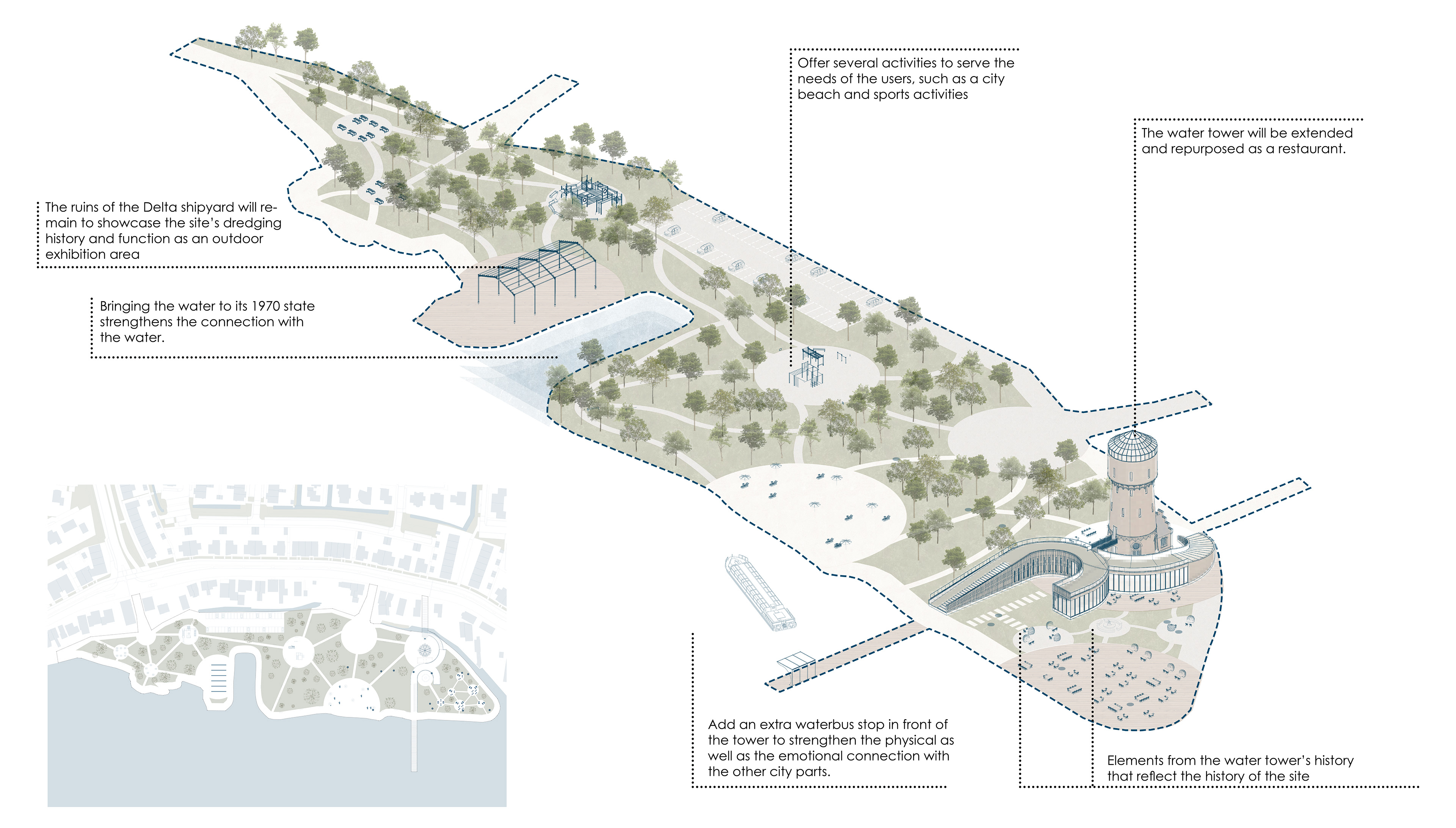 De herontwikkeling van de Sliedrecht Water Tower en het omliggende terrein ‘Het Zaagje’ richt zich op het verbinden van industrieel erfgoed met een nieuw stedelijk landschap. De toren, gebouwd in 1886, vormt een herkenningspunt binnen het landschap en staat symbool voor de geschiedenis van watermanagement en industriële vooruitgang in Sliedrecht. Toch is het terrein waar de toren op staat tegenwoordig een gefragmenteerde en onderbenutte plek aan de rand van de stad, met weinig sociale of functionele interactie met de omgeving.